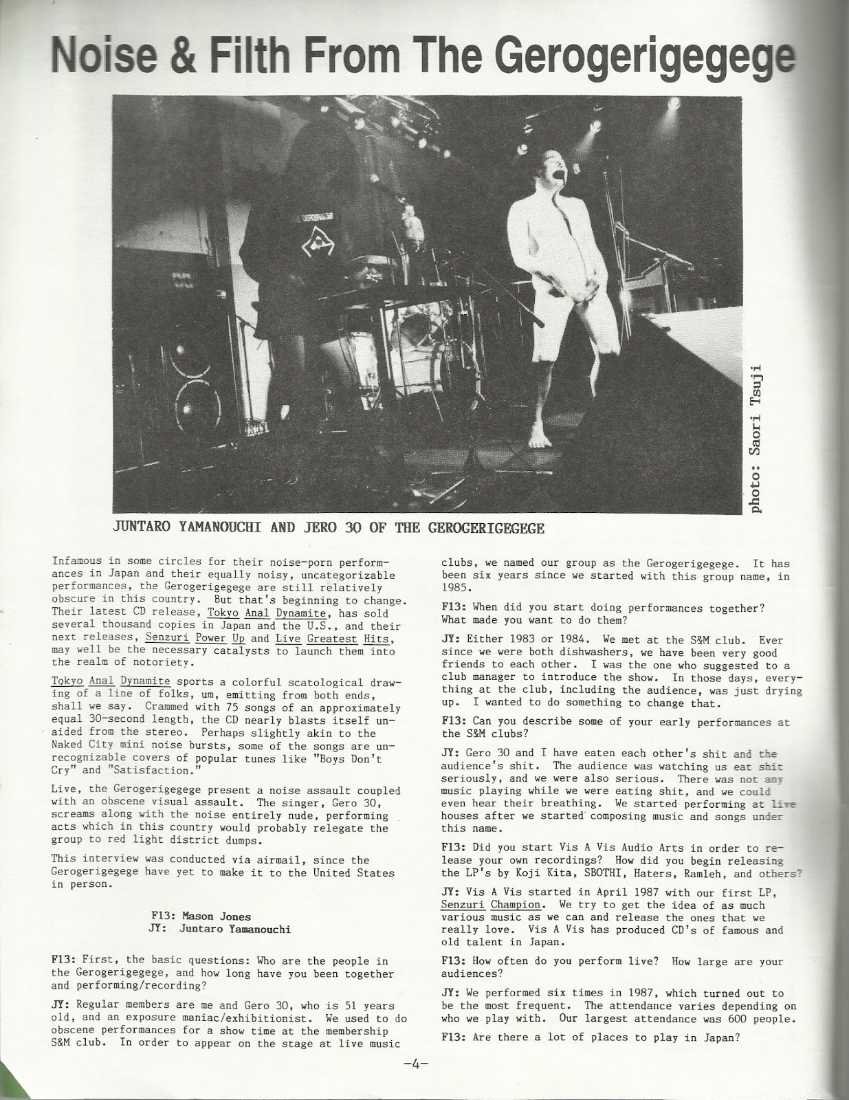 Live, the Gerogerigegege present a noise assault coupled with an obscene visual assault. The singer, Gero 30, screams along with the noise entirely nude, performing acts which in this country would probably relegate the group to red light district dumps.