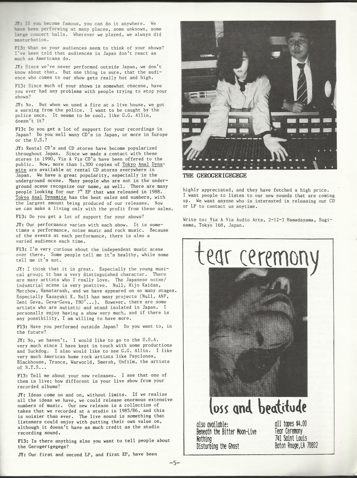 JY: Rental CD’s and CD stores have become popularized throughout Japan. Since we made a contact with these stores in 1990, Vis A Vis CD’s have been offered to the public. Now, more than 1,300 copies of Tokyo Anal Dynamite are available at rental CD stores everywhere in Japan. We have a great popularity, especially in the underground scene. Many people who are not in the underground scene recognize our name, as well. There are many people looking for our 7“ EP that was released in 1988. Tokyo Anal Dynamite has the best sales and numbers, with the largest amount being produced of our releases. Now we can make a living only with the profit from these sales.