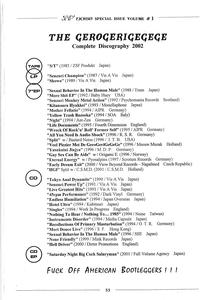 2000 flexi-discs ont été pressés uniquement dans le but d’êtres brûlés lors d’un live. Aussi, j’avais announcé ce live, dans plusieurs types de magazines musicauxu, en le qualifiant de “Release Memorial Performance”. Un public très très nombreux est venu ce jour-là. Evidemmeut, ils attendaient une performance, mais la scule chose qui leur fut donnée de voir est que j’ai brûlé ces disques devant cux. Les disques restants ont été abandonnés sur place pour être récupérés par qui en voulait… Vois-tu, je suis dans l’impossibilité totale de répondre à ta question “pourquoi?”; je peux seulement dire que c’est THE GEROGERIGEGEGE! Pendant que je les cramais, GERO 30 s’envoyait une bonne masturbation.