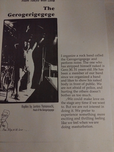 We organized our band in 1985. The first show we had outside of SM Club was October 1986. It was one of activities for student involvement by Japanese university Waseda. We performed at the auditorium of Waseda University with the member of me, Gero 30, two men from Grim (ex-Whitehospital), and Mr. Elle from C.P. Formal member of the Gerogerigegege are me and Gero 30, but more than 30 people have helped and supported us to have a show up to now. We have a show at club (not SM Club) about two times a month.