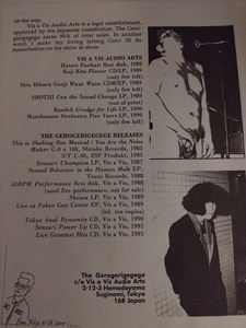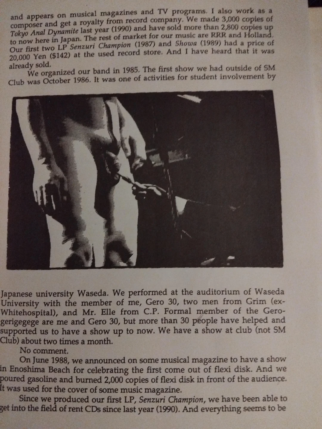 I believe that we have the best sales of records / CD and the greatest popularity in Japanese noise / industrial music. It’s because that the Gerogerigegege perform a variety of music and appears on musical magazines and TV programs. I also work as a composer and get a royalty from record company. We made 3,000 copies of Tokyo Anal Dynamite last year (1990) and have sold more than 2,800 copies up to now here in Japan. The rest of market for our music are RRR and Holland. Our first two LP Senzuri Champion (1987) and Showa (1989) had a price of 20,000 Yen ($142) at the used record store. And I have heard that it was already sold.